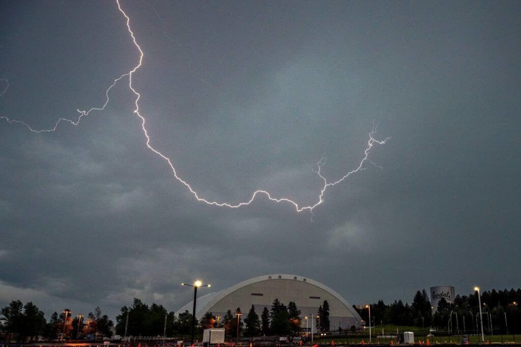 A bolt of lightning arcs across the sky above the University of Idaho Kibbie Dome as a storm passes over Moscow on Saturday evening.